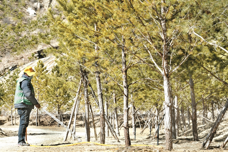 山上有了樹遠(yuǎn)遠(yuǎn)不夠,還要進(jìn)一步提高樹木的成活率,而樹木的成活率離不開后期的管護(hù)工作。因此,每年春天山體解凍后,就要保證每周給樹木澆一次水。另外,由于拉薩紫外線強(qiáng)度大、水分蒸發(fā)量高,有時(shí)還需要給樹木輸送營(yíng)養(yǎng)液……因此,一批批踏著晨露、身披晚霞的樹木養(yǎng)護(hù)工人每天穿梭于山間,檢查樹木的生長(zhǎng)情況,進(jìn)行補(bǔ)植補(bǔ)栽、灌溉等工作。拉薩市圣地園林公司相關(guān)負(fù)責(zé)人多布拉告訴記者:“我們從3月8日開始復(fù)工,作為園林工作人員,搶抓季節(jié)很重要,所以我們現(xiàn)在正在進(jìn)行補(bǔ)植補(bǔ)栽。”