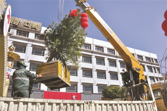 日前,西藏拉薩市城關(guān)區(qū)潔達(dá)園林公司組織工作人員對宇拓路上可移動的景觀花箱進(jìn)行吊裝移除,為下一步更換新的綠化植物做準(zhǔn)備。