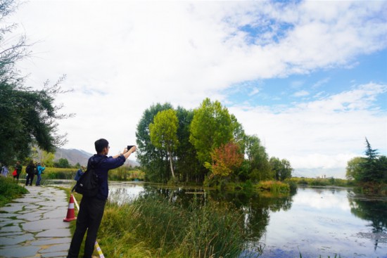 9月初,濕地里的花草樹木從夏天的翠綠到初秋的泛黃,成為了拉魯濕地另一番美景?!∪藗冊诓叫衅溟g,呼吸著充足的氧氣,情緒高漲,邁開輕快而有力的步伐,沿著拉魯濕地步道健步前行,時而駐足觀望沿途美景,時而聚集一方合影留念,不僅鍛煉了身體,又領略了自然風光,也陶冶了情操。