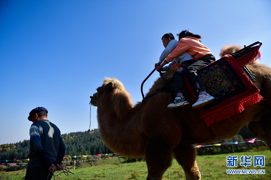 游客在青海省西寧市湟中區(qū)攔隆口鎮(zhèn)卡陽村景區(qū)內體驗騎駱駝。新華社記者 張龍 攝