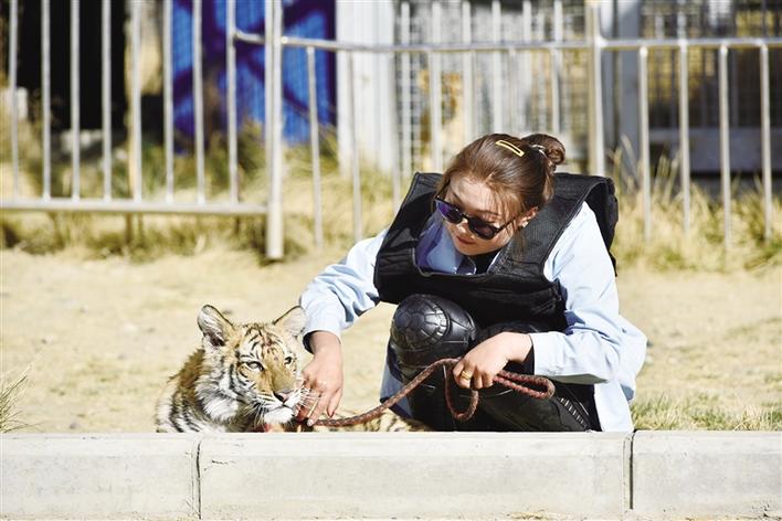 當(dāng)記者看到四只幼獅時(shí),它們時(shí)而聚在一起,時(shí)而沿著籠子邊溜達(dá),時(shí)而張開大嘴向著外人示威,還有一個(gè)非常活躍的在攀爬籠子。小老虎次仁卓瑪雖然沒有兄弟姐妹的陪伴,不過園區(qū)的獸醫(yī)小姐姐成了它最貼心的玩伴。每天,獸醫(yī)小姐姐都會(huì)帶著次仁卓瑪進(jìn)行戶外活動(dòng),次仁卓瑪像小朋友一樣喜歡玩皮球,喜歡追著獸醫(yī)小姐姐跑,還特別喜歡獸醫(yī)小姐姐給它按摩,經(jīng)常會(huì)撒嬌求抱抱。