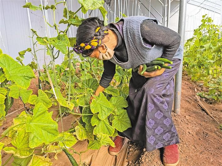 圖為當(dāng)?shù)厝罕娬诖笈飪?nèi)采摘蔬果。史金茹 攝