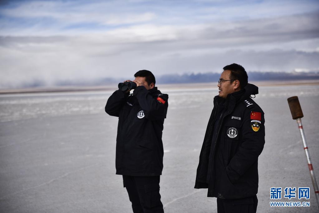 2016年12月1日,袁廣明(右)和隊(duì)友在可可西里腹地查看新生湖水位。新華社記者 吳剛 攝
