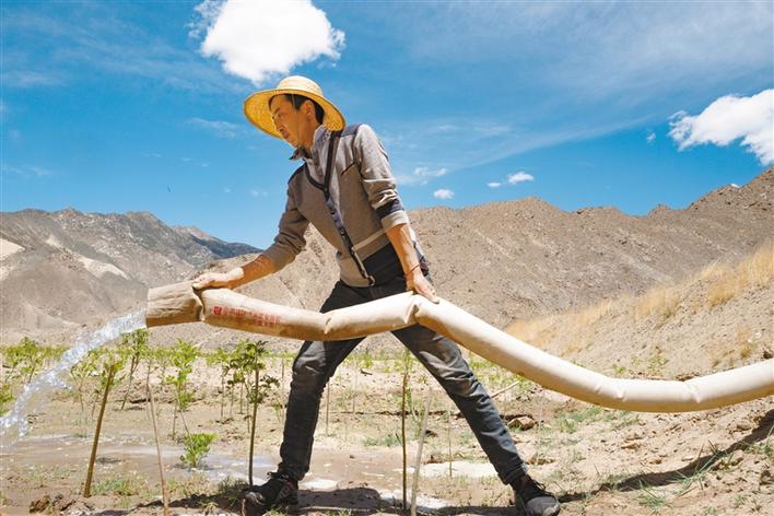 山南市貢嘎縣吉雄鎮(zhèn)劉瓊村村民正在為樹(shù)苗澆水(6月2日攝)。新華社記者 普布扎西 攝