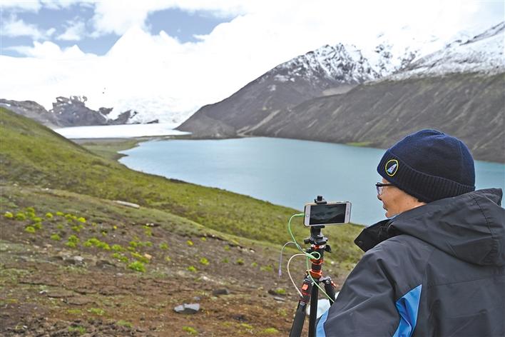 6月9日,來(lái)自湖南的孫先生在拍攝薩普雪山。記者 王藝霏 拉巴卓瑪 曲珍 攝
