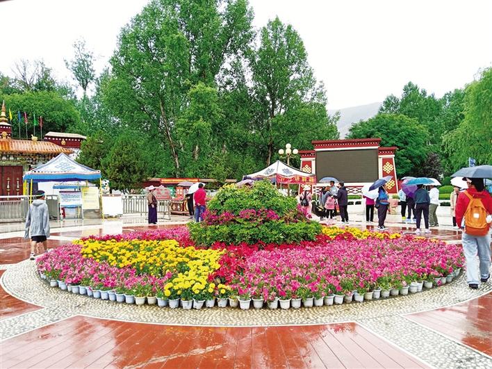 在羅布林卡廣場,擺放的花卉吸引人們拍照打卡留念。走進(jìn)園內(nèi),一陣清涼感迎面撲來,雨后的羅布林卡空氣濕潤,除了花草的香味還可以聞到一絲泥土的氣息。充沛的雨水讓園內(nèi)的樹木更加蔥郁、花朵更加?jì)善G。作為每年盛夏時(shí)期拉薩市區(qū)內(nèi)最佳的避暑去處,羅布林卡吸引著本地市民群眾、區(qū)外游客紛至沓來。