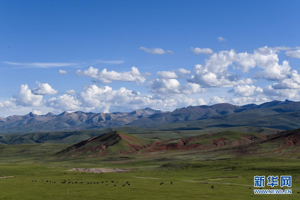 8月,藍(lán)天白云下的玉樹,群山巍峨,河湖縱橫澄碧,草原如茵,仿若一面窗口,在世界第三極,向世人展示著人與自然和諧共生的美麗畫卷。