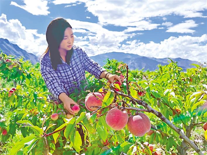 還未走進桃園,桃子特有的清甜香味便撲鼻而來。當?shù)毓ぷ魅藛T告訴記者,快熟了的桃子半青半紅,吃起來很美味。在他的指引下,記者摘下一顆白中透粉的桃子,這種已經(jīng)熟透的桃子,桃肉松軟,咬一口,清香又甜蜜的汁水就一涌而出,瞬間征服味蕾。