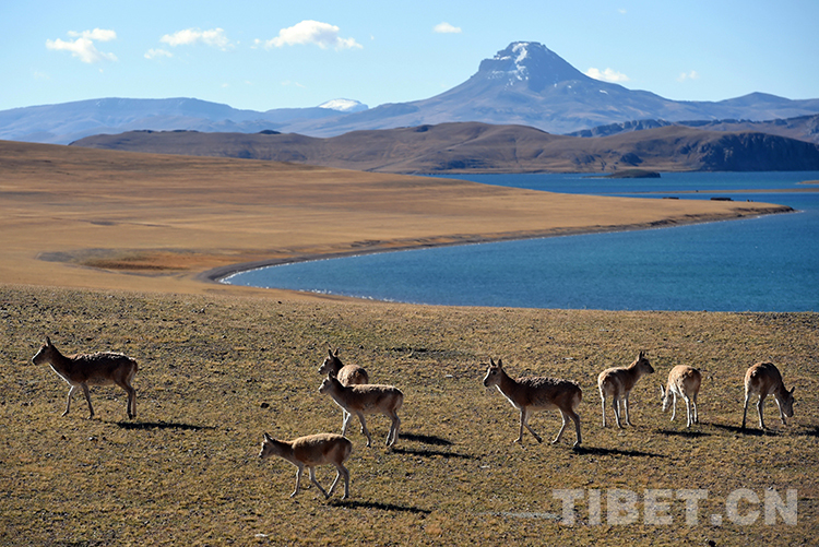 湖濱河畔,地勢平坦開闊,水草豐盛甜美,是藏羚羊頻繁活動(dòng)的場所。藏羚羊是一種善跑的動(dòng)物,跑起來輕快灑脫、疾如長風(fēng),時(shí)速可達(dá)80公里。