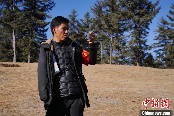 圖為桑杰加用手機(jī)記錄自己巡護(hù)的林場(chǎng)。 馬銘言 攝