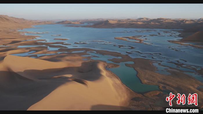位于庫木庫里沙漠腹地的沙子湖薄冰化盡,蔚藍(lán)的湖水與金黃的沙山、遼闊的碧空交相輝映?!∩轩i 攝