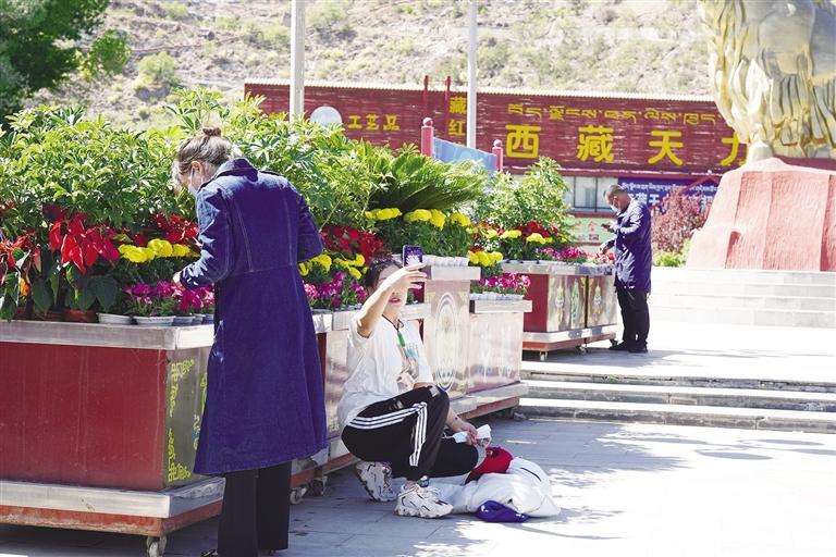 如今,走在市區(qū)街頭或公園,隨處可以看到開花的樹種,有的已經(jīng)凋零,有的開得正艷,有的含苞待放。在布達(dá)拉宮腳下的北京中路道路兩側(cè)櫻花全面盛開,粉紅色的櫻花宛如云霞,花瓣隨著微風(fēng)簌簌落下,煞是浪漫。將初夏的北京中路裝扮成一幅美麗的畫卷,吸引許多市民和游客賞花拍照。