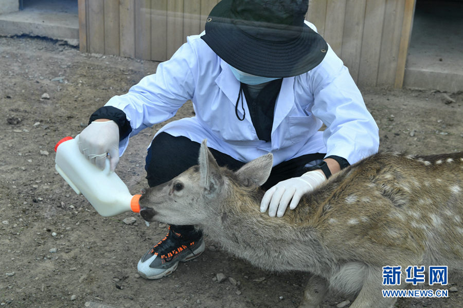 在祁連山國家公園青海片區(qū)野生動物救護繁育中心內(nèi),工作人員正在給馬鹿喂奶。新華網(wǎng) 卡婭梅朵 攝