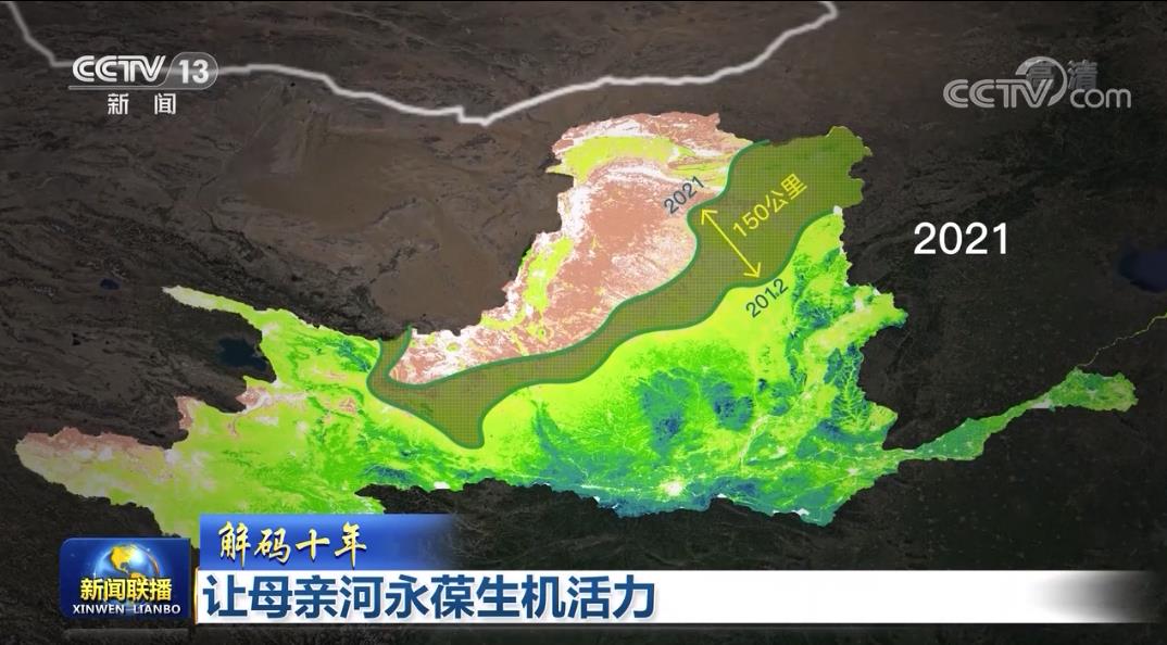 這是衛(wèi)星視角拍攝到的黃河,研究人員連續(xù)數(shù)年監(jiān)測(cè),結(jié)合大數(shù)據(jù)還原了黃河沿岸的生態(tài)狀況。可以清晰地看到,十年間綠進(jìn)沙退,這條黃河生態(tài)綠線最寬處向前推進(jìn)了約150公里。