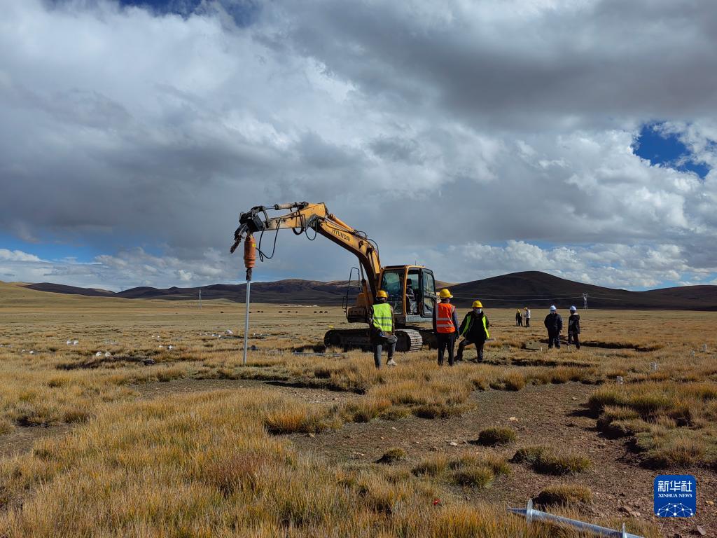 在西藏華電那曲色尼區(qū)12萬千瓦光伏發(fā)電電力保供項目工地,工人們正安裝螺旋樁。(受訪單位供圖)