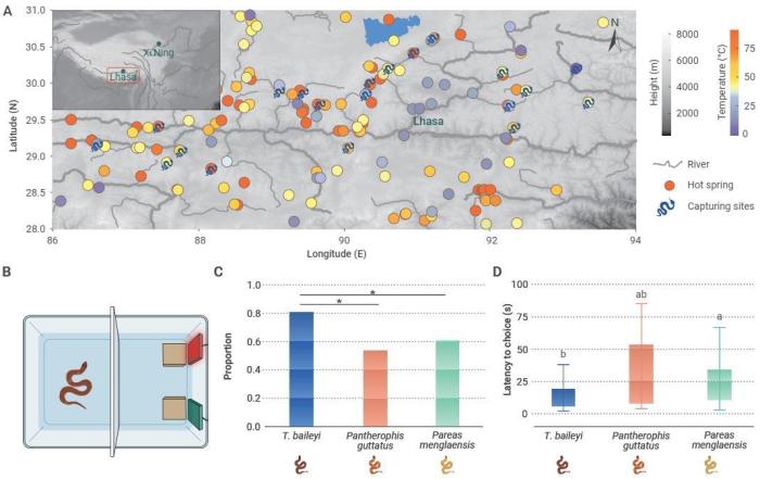 中國(guó)科研人員結(jié)合野外調(diào)查和文獻(xiàn)調(diào)研,整理了高原地?zé)豳Y源以及溫泉蛇的分布信息,發(fā)現(xiàn)溫泉蛇高度偏好溫泉生境。通過趨熱行為學(xué)實(shí)驗(yàn)證明,相較于另外兩種低海拔蛇類,溫泉蛇能夠更快速地定位到高溫區(qū)域,且對(duì)高溫區(qū)表現(xiàn)出強(qiáng)烈的偏好,提示溫泉蛇具有高效的溫度感知能力。