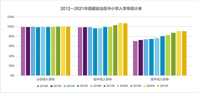 教育事業(yè)成果豐碩。全區(qū)共有各級各類學(xué)校3339所,在校學(xué)生92萬人。圖為西藏自治區(qū)中小學(xué)入學(xué)率統(tǒng)計(jì)表。