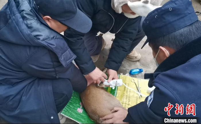圖為移民管理警察與獸醫(yī)站人員為赤麂包扎傷口?!⌒?yīng)天 攝