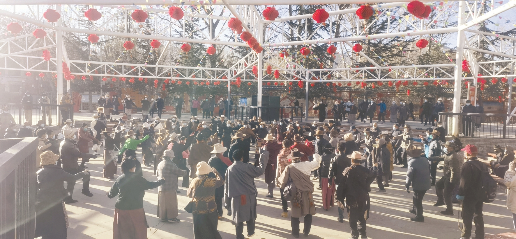 宗角祿康公園是市民群眾戶外活動(dòng)的重要場(chǎng)所,近年來,為豐富群眾精神文化生活,拉薩市大力倡導(dǎo)全民健身,不斷完善公園健身器材,這里已成為市民每天進(jìn)行晨練和休閑的首選之地。一大早,記者來到該公園看到,藏歷新年臨近,公園內(nèi)到處掛起了紅紅火火的燈籠,讓公園換上了“新裝”,在陽光的照射下,鮮艷奪目,喜氣洋洋,與公園風(fēng)景交相輝映,形成一道道靚麗的風(fēng)景線。市民們不約而同地來到這里開展健身操、鍋莊、現(xiàn)代舞等健身活動(dòng)。