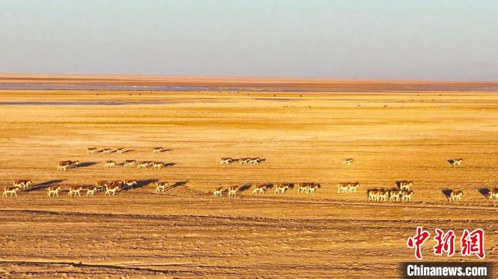 在平均海拔4500多米的阿爾金山上,遼闊的依協(xié)克帕提湖冬雪初融,清澈的湖面上尚未融盡的薄冰宛如一面光滑的鏡子,將高原蔚藍的天空倒映在湖面上;芳草叢生的湖岸邊,有著“高原坦克”之稱的野牦牛在水源地附近悠閑漫步,享受著大自然賜予的春日“盛宴”;時而有三五成群的藏羚羊從牦牛群旁經(jīng)過,他們有的邁著小碎步追逐嬉戲,有的則停步駐足,好奇地打量著周邊的環(huán)境;擅長奔跑的藏野驢成群結(jié)隊地奔跑著,飛奔的藏野驢群騰起一路煙塵,展現(xiàn)出別具一格的野性之美……