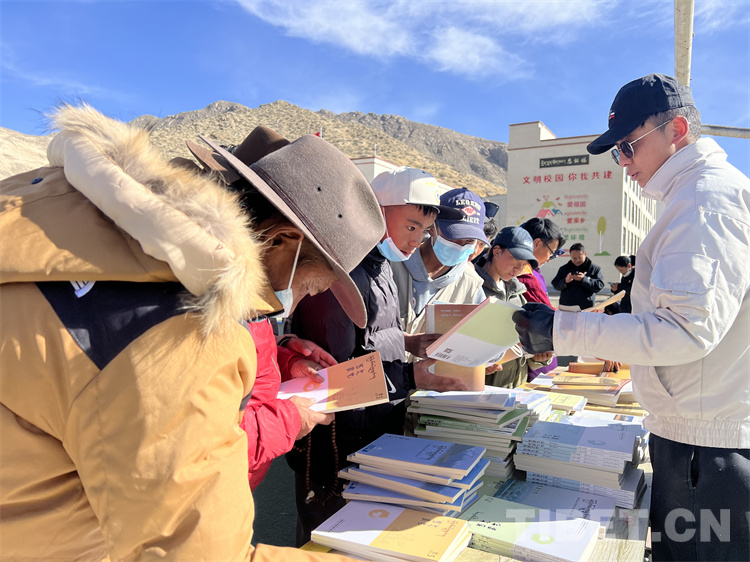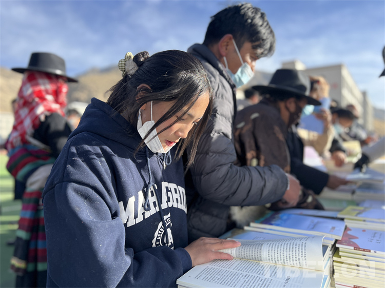 在送“書籍” 現(xiàn)場,《西藏文學(xué)》《西藏文藝》《邦錦梅朵》三個(gè)編輯部工作人員為現(xiàn)場群眾和當(dāng)?shù)馗刹抠浰蜁?,?dāng)?shù)厝罕姾蛯W(xué)生們紛紛前來翻看尋找自己喜歡的書籍,大家人手幾本書?!拔移綍r(shí)喜歡閱讀藏文文學(xué)作品,這次要了兩本文學(xué)相關(guān)書籍拿回家閱讀”17歲的益西巴珍說。據(jù)了解,此次活動(dòng)西藏文聯(lián)向熱愛閱讀的群眾和學(xué)生共贈送1500本(冊)文藝書籍和期刊。