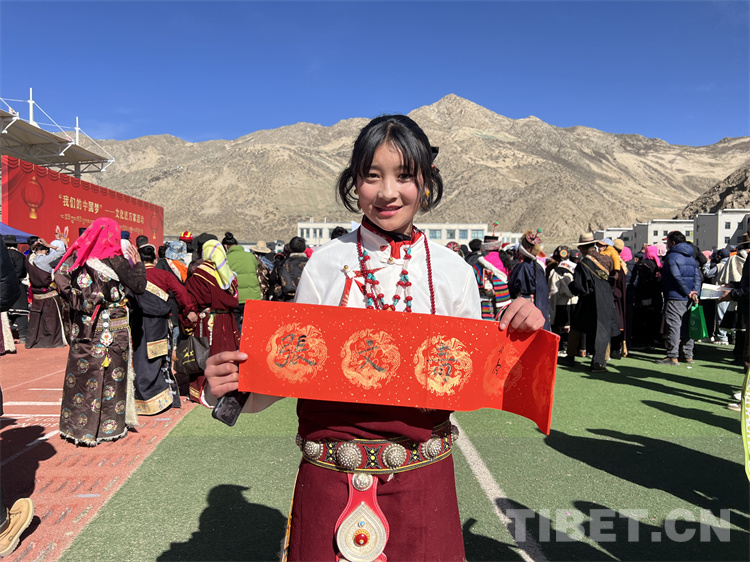 來到送“書法”現(xiàn)場,書法家們早早地來到活動(dòng)現(xiàn)場,他們準(zhǔn)備筆墨、鋪開紙張,為現(xiàn)場群眾書寫藏、漢文新年對聯(lián),“?!弊帧ⅰ凹槿缫狻?、“扎西德勒”等寓意美好的祝福。書法家協(xié)會副主席祖牛拉巴次仁說:“從春節(jié)開始,我們書法家們?nèi)W(xué)校、社區(qū)、搬遷安置點(diǎn)等地,書寫了超過1萬件的書法作品。這些作品深受大家的喜愛,我們后續(xù)也會繼續(xù)開展送‘書法’公益活動(dòng)”。現(xiàn)場群眾聚集在送“書法”現(xiàn)場,“西熱措姆”“張文青”“索朗旺青”“朗嘎達(dá)瓦”……孩子們爭先恐后請書法家把自己的名字寫在紅紙上。“這是我的名字,我爸是西寧人,我媽是那曲的,我們是從那曲安多縣搬遷過來的,我現(xiàn)在在森布日幸福中學(xué)上初三,將來要考那曲高級中學(xué)”張文青拿著書家贈給她的“名字”用流利的那曲話對記者說。