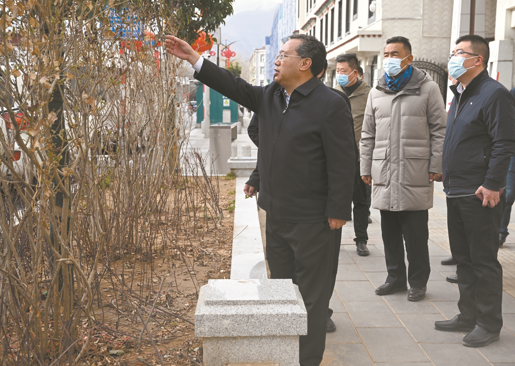 3月15日,西藏自治區(qū)黨委常委、市委書記普布頓珠帶隊深入城關區(qū),調研城市建設管理工作。圖為普布頓珠在朵森格路中段調研道路兩旁綠化帶植物缺損問題。拉薩融媒記者 巴桑次仁攝