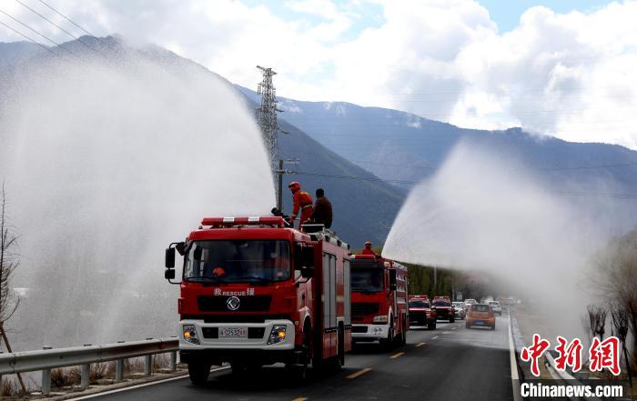 林芝市森林消防支隊消防員正在進行灑水增濕作業(yè)?!∥骼@拉翁 攝