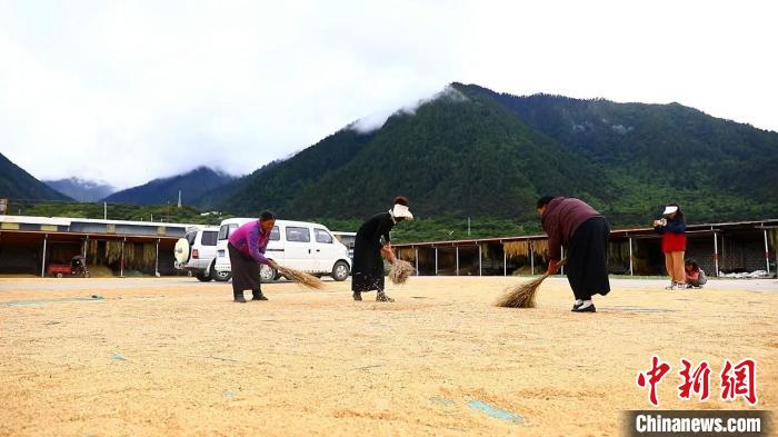 圖為羌渡崗村村民正在曬青稞。巴吉 攝