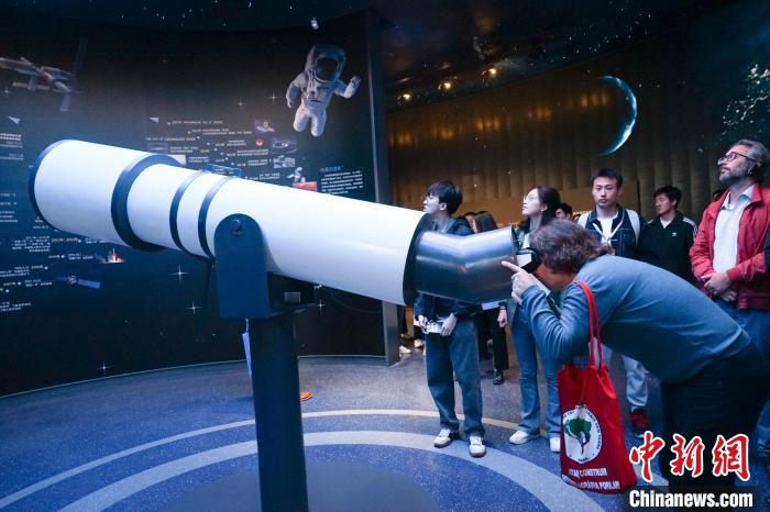 圖為一位外國政黨代表在青海省自然資源博物館內(nèi)體驗用VR技術(shù)呈現(xiàn)的天文望遠鏡。馬銘言 攝