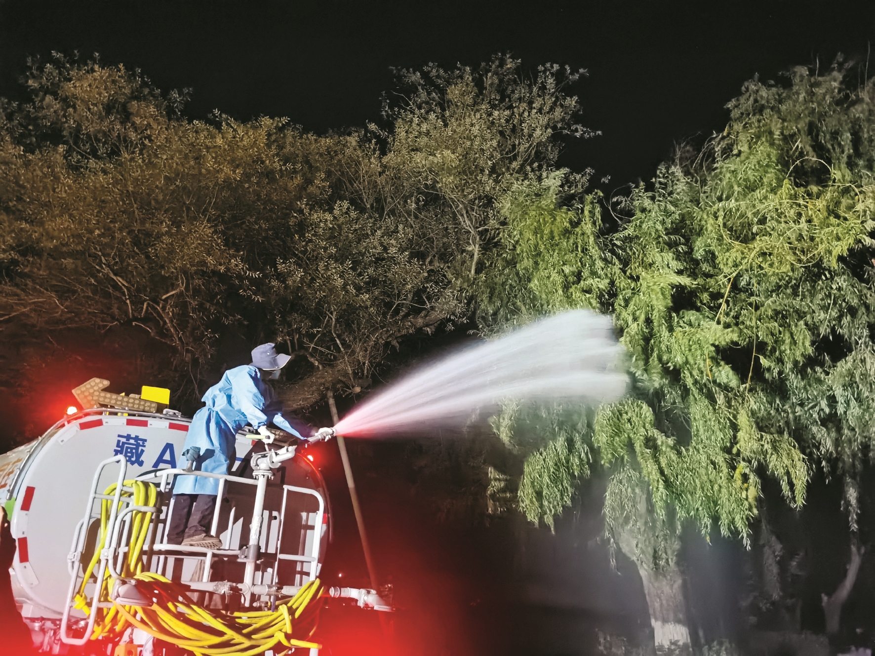 圖為城關(guān)園林養(yǎng)護(hù)人員正在對羅布林卡廣場苗木噴藥殺蟲。拉薩融媒記者 范江英攝