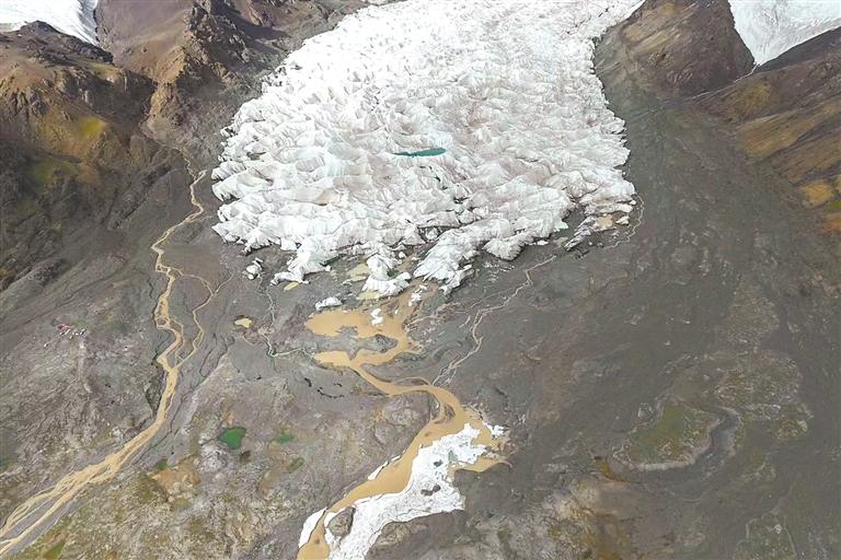 圖為長(zhǎng)江源頭格拉丹東雪山姜根迪如冰川。(無人機(jī)拍攝)記者 曲珍 攝