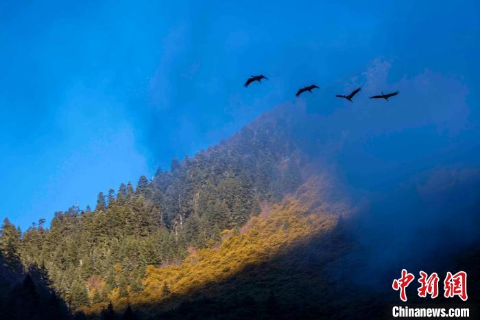 西藏林芝巴松措景區(qū)迎“高原精靈”黑頸鶴越冬