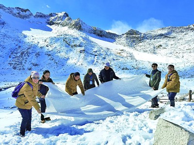 四川阿壩州,中國科學(xué)院西北生態(tài)環(huán)境資源研究院科研人員在為冰川“蓋被子”。謝宜達(dá)攝/光明圖片