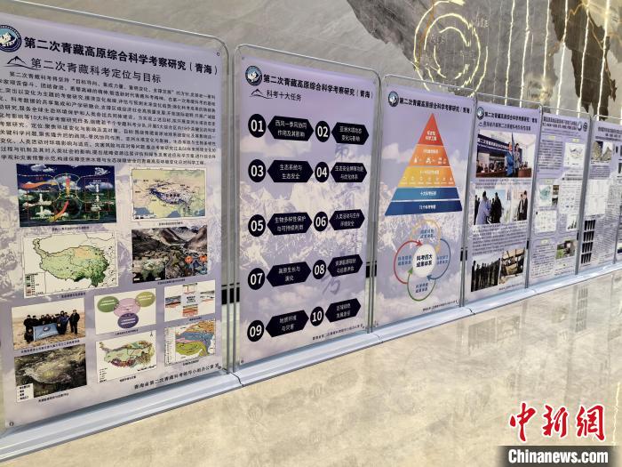圖為第二次青藏科考成果助推青海交通高質(zhì)量發(fā)展對(duì)接會(huì)場外展板,展示科考項(xiàng)目?!∑钤鲚頂z