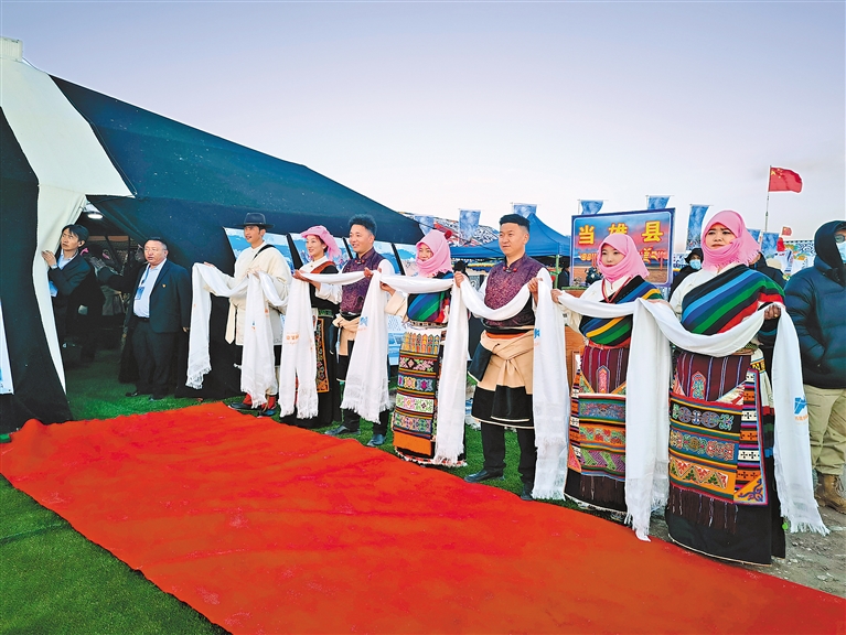 開湖意味著旅游旺季的到來。當雄縣、尼木縣、曲水縣、城關(guān)區(qū)等縣區(qū)都搭起彩色帳篷,展示特色美食、文創(chuàng)產(chǎn)品和非遺文化。各縣區(qū)的文旅局長們集體“出攤”,向來賓做著熱情細致的宣介。林周縣的帳篷前,4位藏族農(nóng)牧民跳起舞蹈,這是從夯墻勞作中誕生的傳統(tǒng)舞蹈“阿嘎舞”;達孜區(qū)展出青稞精釀白啤酒、以黑頸鶴為靈感創(chuàng)作的文創(chuàng)產(chǎn)品、知名品牌的古檀香等特色商品;曲水縣在醒目位置放置著全域旅游手繪地圖、文旅產(chǎn)業(yè)招商引資項目介紹等手冊。