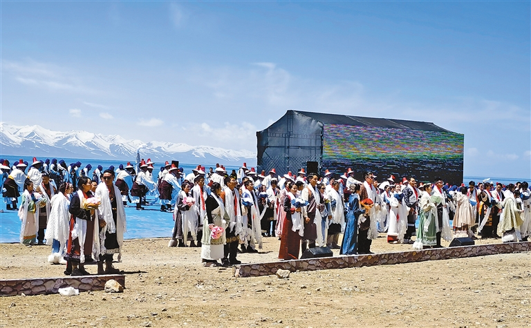 由300名演員將象征平安、吉祥的馬、牦牛、牛角、五彩哈達等元素融入表演全過程,藝術(shù)地展現(xiàn)獨有的開湖祈福場景。