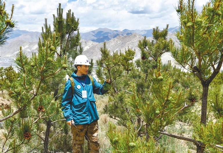 工程的綠意還延伸至拉薩貢嘎機(jī)場(chǎng)周邊的山體,山南市林草局林業(yè)和草原有害生物防治站檢疫員次仁羅布在造林現(xiàn)場(chǎng)進(jìn)行苗木復(fù)檢工作,復(fù)檢結(jié)果顯示這批苗木的成活率達(dá)到92%?!斑@里是走出貢嘎機(jī)場(chǎng)的第一站,旅客們可以直接看到我們種下的綠色,很有意義?!贝稳柿_布說(shuō)。