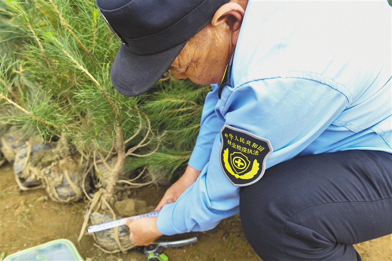 在拉薩南北山綠化工程2024年度鞏固提升(貢嘎機(jī)場(chǎng)周邊山體)工程項(xiàng)目上,林業(yè)檢疫執(zhí)法工作人員在檢查樹(shù)苗根部土球是否達(dá)標(biāo)。新華社記者 晉美多吉 攝