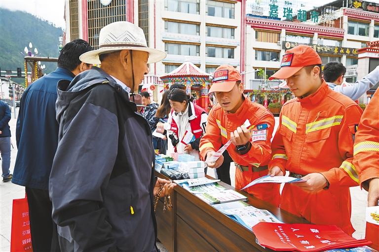 活動現(xiàn)場,波密縣森林消防中隊消防員通過發(fā)放防災減災宣傳資料、講解安全生產常識的形式,向過往群眾宣傳普及森林火災、洪澇、山體滑坡、地震等自然災害以及逃生自救、互救知識和技能。