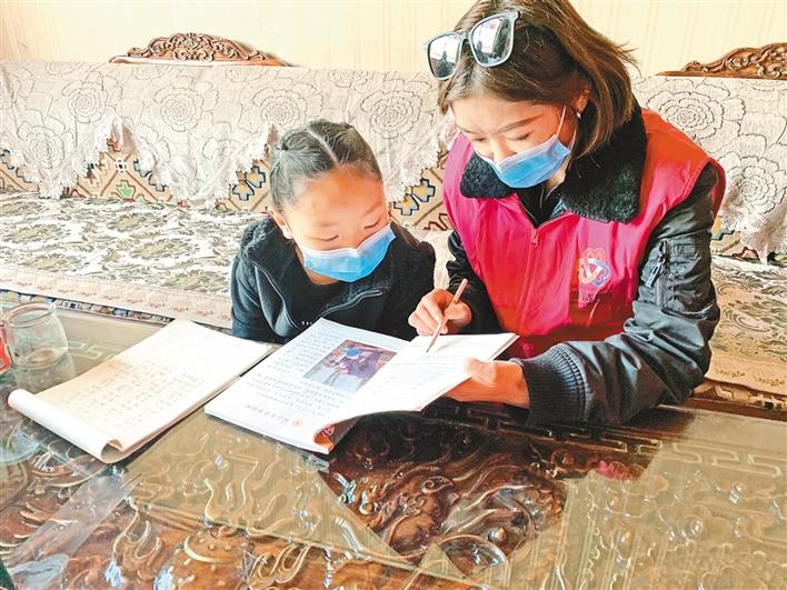 西藏那曲索縣“四講四愛(ài)”宣講團(tuán)成員在進(jìn)行入戶(hù)宣講的同時(shí),積極開(kāi)展送教活動(dòng)。圖為索縣廣電中心副主任科員兼“四講四愛(ài)”辦工作人員次仁德吉入戶(hù)為學(xué)生輔導(dǎo)課后作業(yè)。記者 萬(wàn)靖 張宇 攝