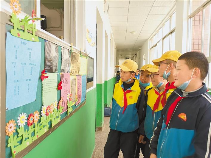 圖為桑珠孜區(qū)第二中學(xué)初二學(xué)生在教師走廊參觀學(xué)習(xí)班級動態(tài)展板。 記者 扎西頓珠 攝