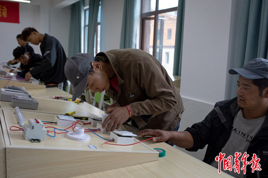29歲的扎西才登(右二)在電工教室練習(xí)線路組裝。李雋輝/攝