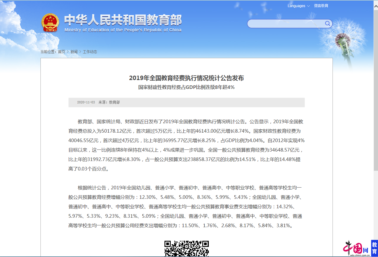 在教育部、國(guó)家統(tǒng)計(jì)局、財(cái)政部公布的《統(tǒng)計(jì)公告》中,中國(guó)網(wǎng)記者注意到,2019年全國(guó)教育經(jīng)費(fèi)總投入為50178.12億元,首次超過(guò)5萬(wàn)億元,比上年的46143.00億元增長(zhǎng)8.74%。
