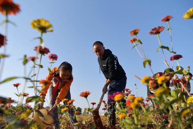寨下鎮(zhèn)中心小學(xué)的學(xué)生們在花田勞動,給花松土、澆水(11月9日攝)。
