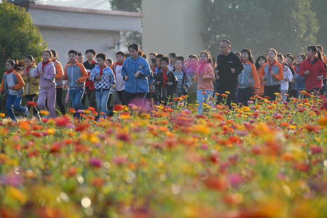寨下鎮(zhèn)中心小學(xué)校長殷大福帶著學(xué)生們在花田邊晨練(11月10日攝)。