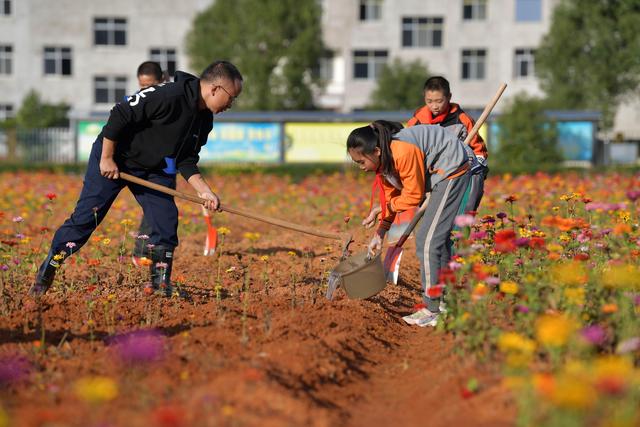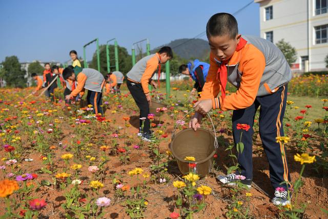 今年暑假剛剛到任江西省宜春市袁州區(qū)寨下鎮(zhèn)中心小學(xué)的殷大福校長看著教學(xué)樓前一大片長滿雜草的荒地,希望能在上面做點文章,讓孩子們課后有個休閑活動的好去處。于是,他和老師們一起平整荒地,種下百日草的種子,開辟出花田和草坪。如今,昔日的荒地上已綻放出一片絢爛的花海,學(xué)生們的學(xué)習(xí)生活因此更加豐富多彩。美術(shù)課、十字繡興趣小組的同學(xué)紛紛到花田邊寫生、采風(fēng),孩子們在綠地里玩耍訓(xùn)練。每周,殷大福校長還會組織不同班級的學(xué)生下田勞動,為鮮花松土、施肥、澆水,讓他們親身體驗守護生活中美好的滋味。呵護、陪伴、欣賞……一顆顆真善美的種子在學(xué)生們的心底悄然種下。