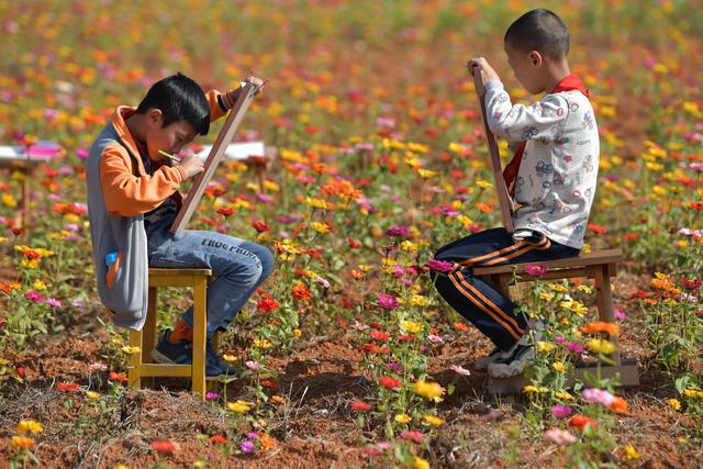 寨下鎮(zhèn)中心小學(xué)的學(xué)生們在花田寫生(11月9日攝)。新華社記者 彭昭之 攝