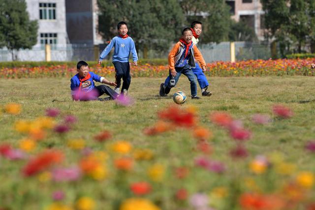 寨下鎮(zhèn)中心小學(xué)的學(xué)生們在花田間的草地上踢足球(11月9日攝)。