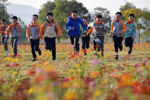 寨下鎮(zhèn)中心小學(xué)的學(xué)生們在花田間的綠地玩耍(11月9日攝)。